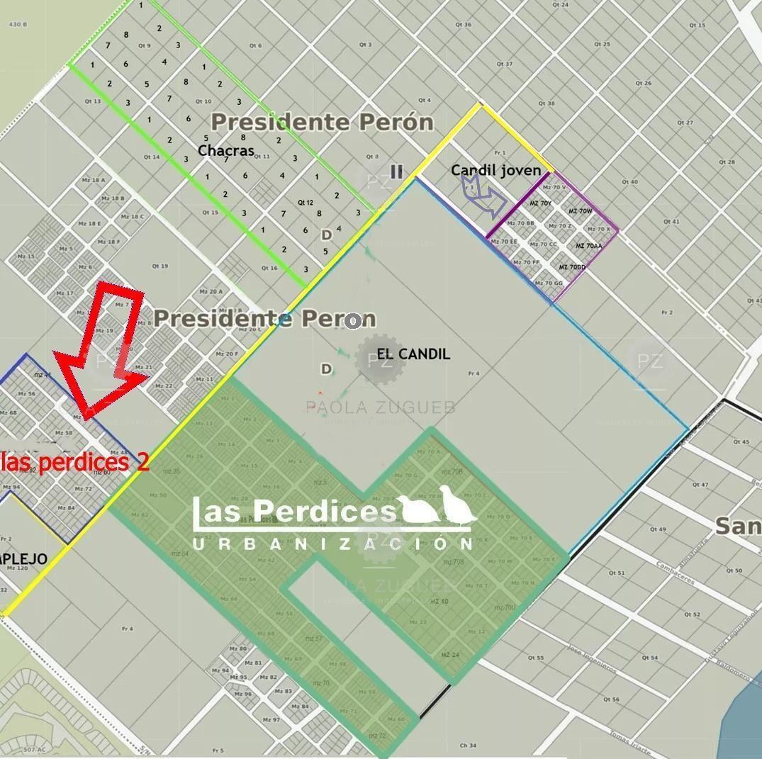 Las Perdices 2. Urbanización protegida ubicada a metros de la Ruta 16, en la Zona Canning- San Vicente, en el límite de Guernica (Pte. Perón) y San Vicente (San Vicente). Lotes de 500 a 850 m2. Se transfieren derechos posesorios. Tras el éxito de las Perdices 1, se está llevando adelante Las Perdices 2. Es un barrio de perímetro cerrado con alambre olímpico y control de acceso en la entrada las 24hs. Cuenta con áreas comunas parquizadas. Bajos costos de mantenimiento, mucho menor al valor de las expensas de los Barrios de la zona. En los lotes se pueden construir viviendas unifamiliares, como así también quincho y pileta con cerco. La zona es estratégica, por ubicarse sobre la Calle Pampero (acceso directo a San Vicente, 7 km) y Marechal, en zona de amplio crecimiento. La Ruta 16, la Ruta 58, la Autopista Pte. Perón y la Ruta 6 permiten acceder a toda la Zona Sur de GBA, a CABA y al interior de la Provincia de Buenos Aires. El barrio es una Urbanización protegida, con los beneficios que le da la reglamentación. Lotes desde 10900 Usd